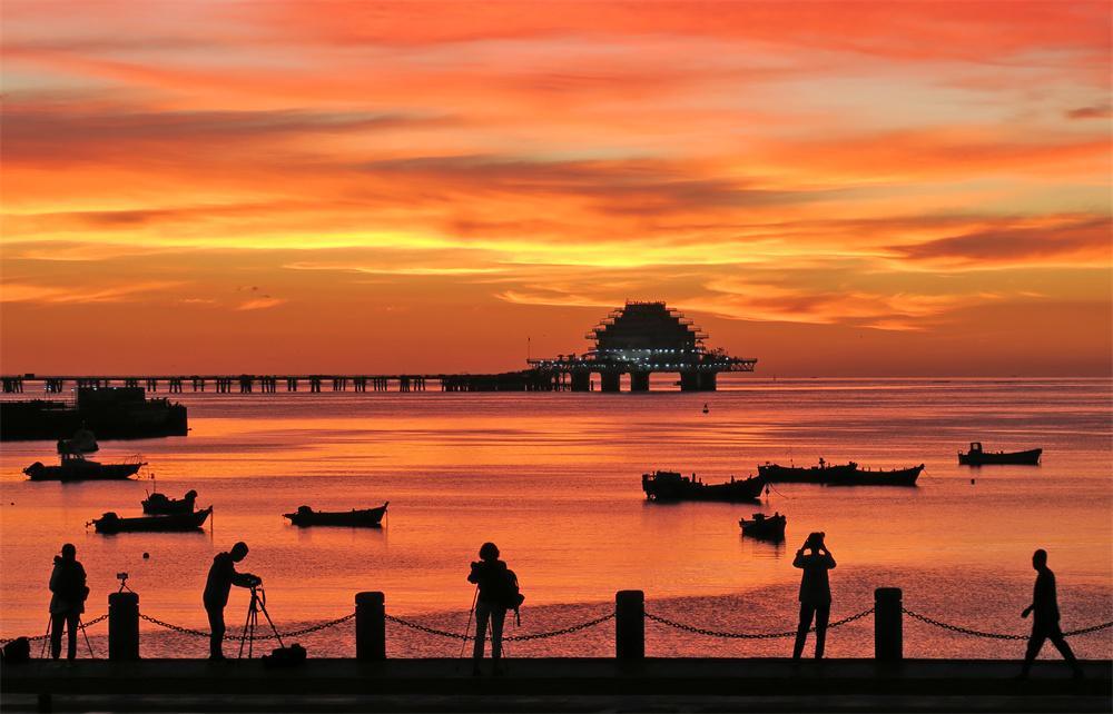 莱山区海滨朝霞绚烂,海天尽染,迷人的景色吸引了不少市民和游客前来观赏拍照。YMG全媒体记者 唐克 摄