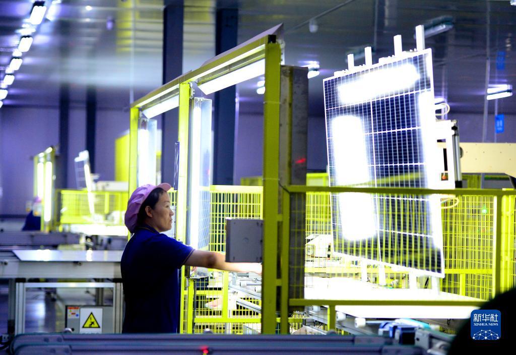 9月17日,在山东省东营经济技术开发区润马光能科技有限公司生产车间,工人对太阳能电池板进行质量检测。
