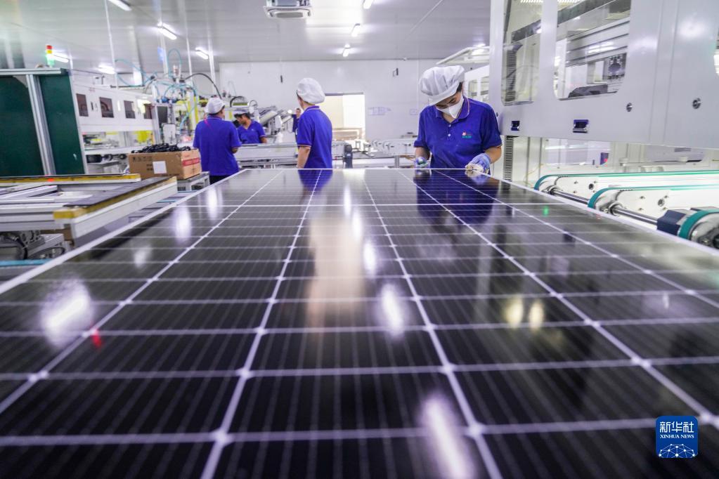 9月17日,山东省东营经济技术开发区润马光能科技有限公司工人在生产太阳能电池板。