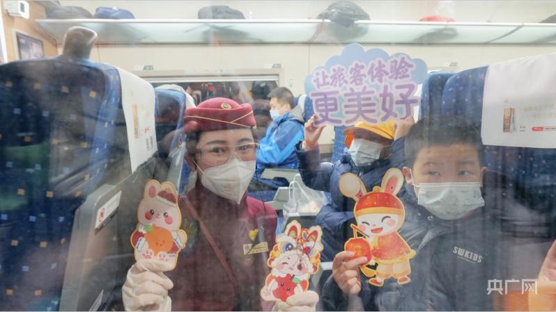 列车员与小朋友在车厢内合影(央广网记者 朱冠安 摄)