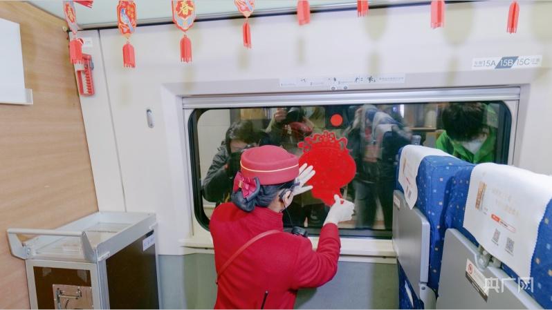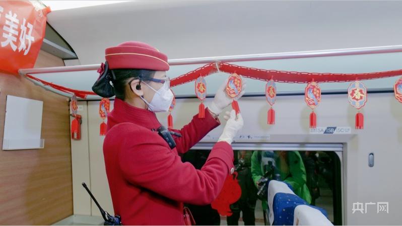 列车员正在装饰春运列车(央广网记者 朱冠安 摄)