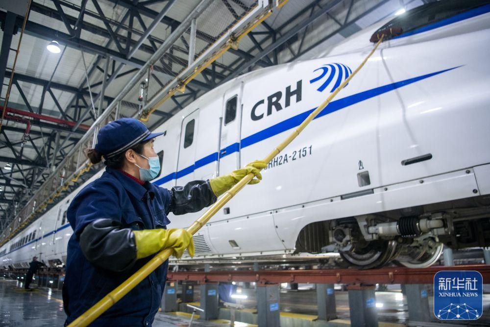1月6日,地勤机械师在检查动车组列车车体外观状态。新华社记者 伍志尊 摄