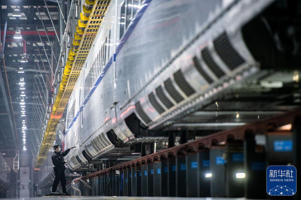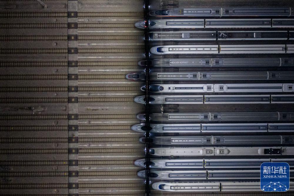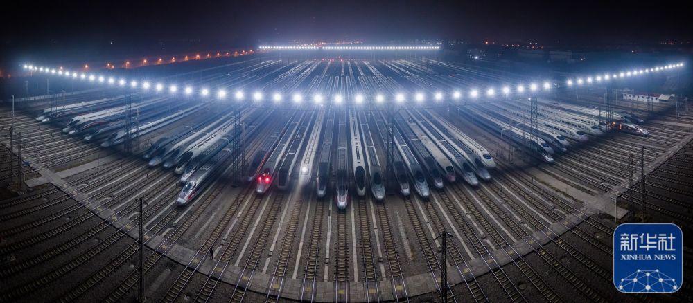 1月7日,2023年春运启动。在武汉动车段,工作人员通宵对近130组动车进行检修、保温作业,停靠在存车线上的动车排列整齐如同一支“陆地舰队”。