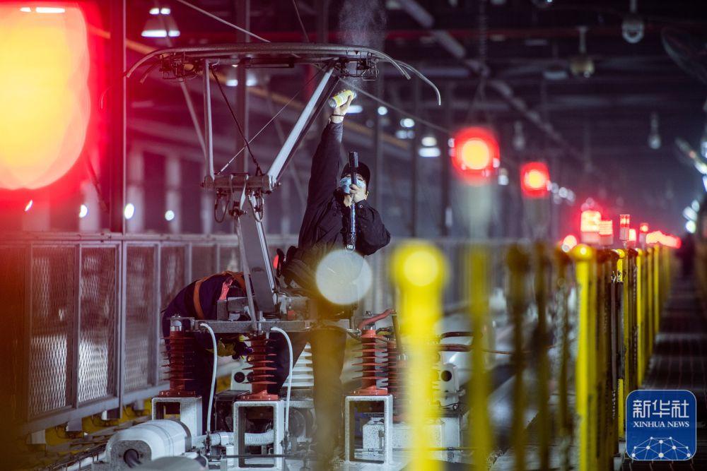 1月6日,地勤机械师在检修动车组列车的受电弓。新华社记者 伍志尊 摄