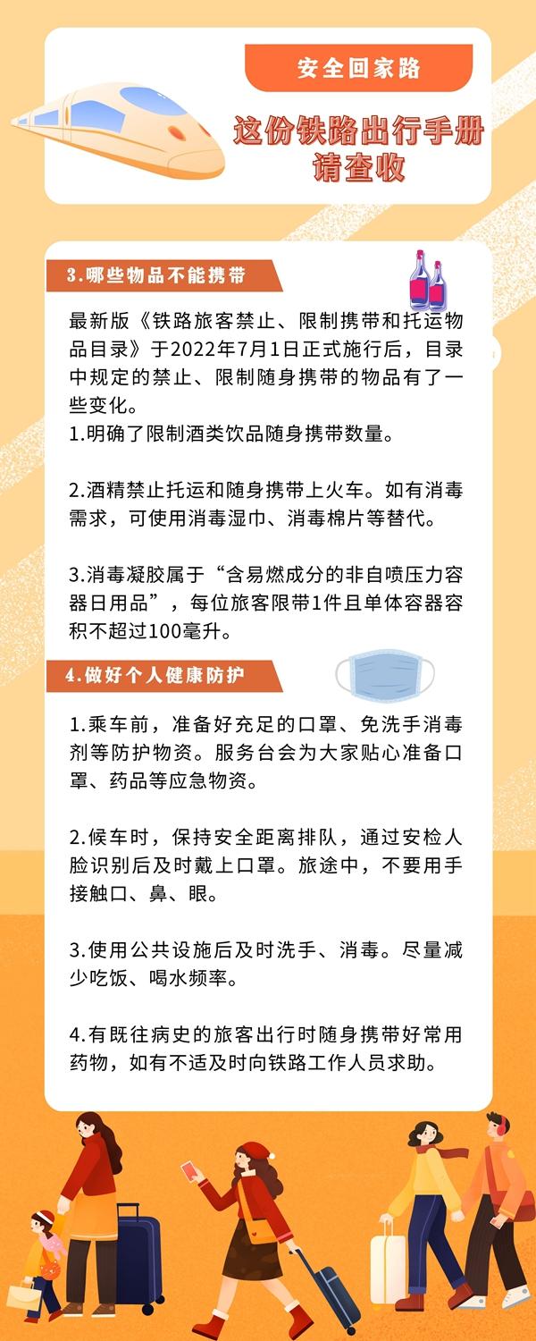 1月7日,为期40天的2023年春运正式启动。从目前的车票预售情况看,今年的春运客流高峰发送量或将达到2019年疫情前水平。铁路出行有哪些注意事项,哪些东西不能带上火车?如何做好个人健康防护?这份出行手册请查收。