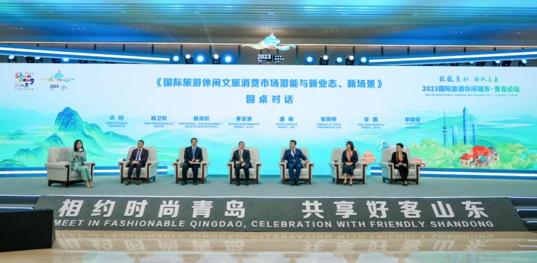 论坛的圆桌对话环节,青岛市文化和旅游局党组书记、局长潘峰,重庆市文化和旅游发展委员会党委委员、副主任秦定波,中国旅游研究院国际研究所所长杨劲松,中国传媒大学广告学院旅游传播研究中心主任张婷婷 ,欢迎中国总裁申晓亚 Jacopo Sertoli ,香港中旅国际投资有限公司副总经理杨卫权,中国工商银行青岛市分行党委委员、副行长李霞等领导嘉宾,围绕国际旅游休闲文旅消费市场潜能与新业态、新场景交流研讨、建言献策,同谋打造文旅行业斑斓多彩的“诗与远方”。