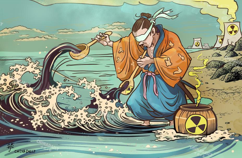 日本政府悍然“蒙上双眼”决定将福岛第一核电站的百万吨核污水经过滤稀释后排入大海。(来源:中国日报 马雪晶 英文《中国日报》2023年4月28日8版)