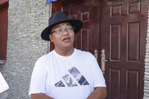 2023年7月22日,在长江源村文化广场前,唐古拉山镇党委书记索南东主分享他参与长江生态保护的心得。王筝 摄