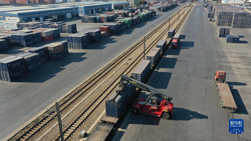 中老铁路货运列车在中铁联集昆明中心站装运货物(无人机照片,2022年11月22日摄)。新华社记者 胡超 摄