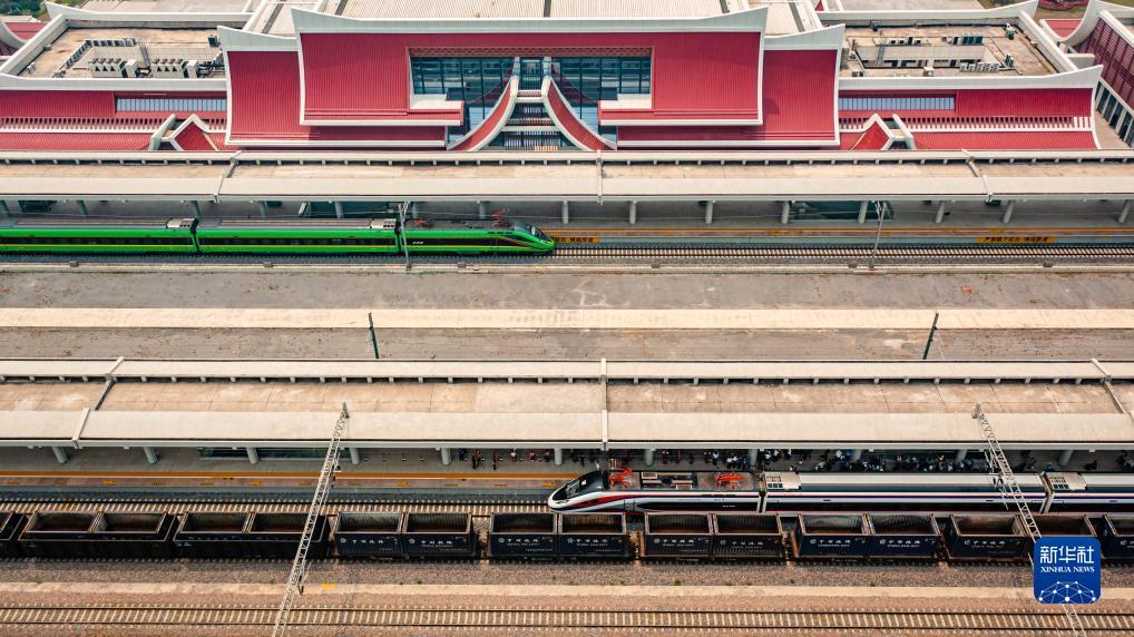 4月13日,“复兴号”(上)、“澜沧号”动车组列车停靠在中老铁路磨憨站(无人机照片)。新华社记者 胡超 摄