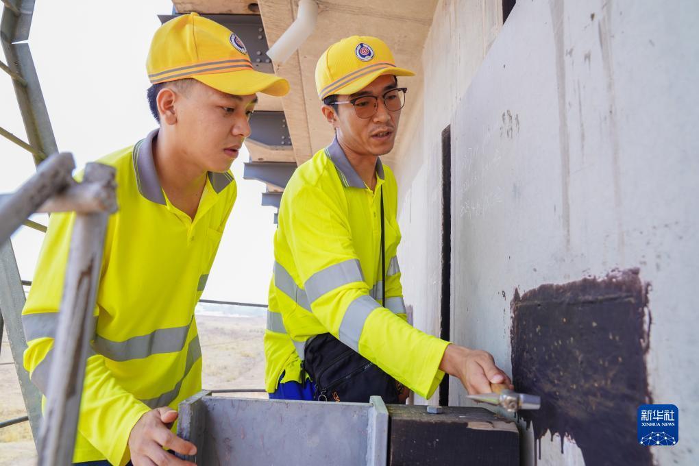 4月10日,在中老铁路磨万段,杨烨(左)在中国师傅赵云龙指导下进行桥梁检查。新华社发(普宏思 摄)