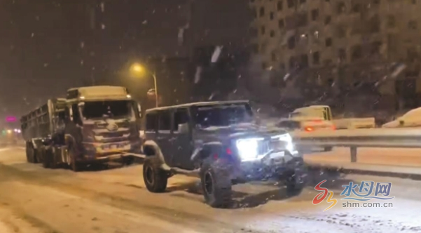 水母网12月21日讯(YMG全媒体记者 何晓波 摄影报道)12月20日凌晨零点,栖霞市城区民生路由东向西陡坡路段,驾驶着越野车拖拽雪地打滑车辆的路运鹏已经忙碌了4个多小时。当一辆河北籍19米超长大货车被艰难拖上坡后,司机感动地说:“烟台人真好!栖霞人真好!”风雪夜里,路运鹏的爱心之举温暖了那些素不相识的司机们。