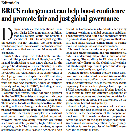 1月1日,沙特、埃及、阿联酋、伊朗、埃塞俄比亚成为金砖国家正式成员。自此,金砖国家拥有了10个正式成员国。这既表明了金砖国家对世界的吸引力,也展现了发展中国家的凝聚力。