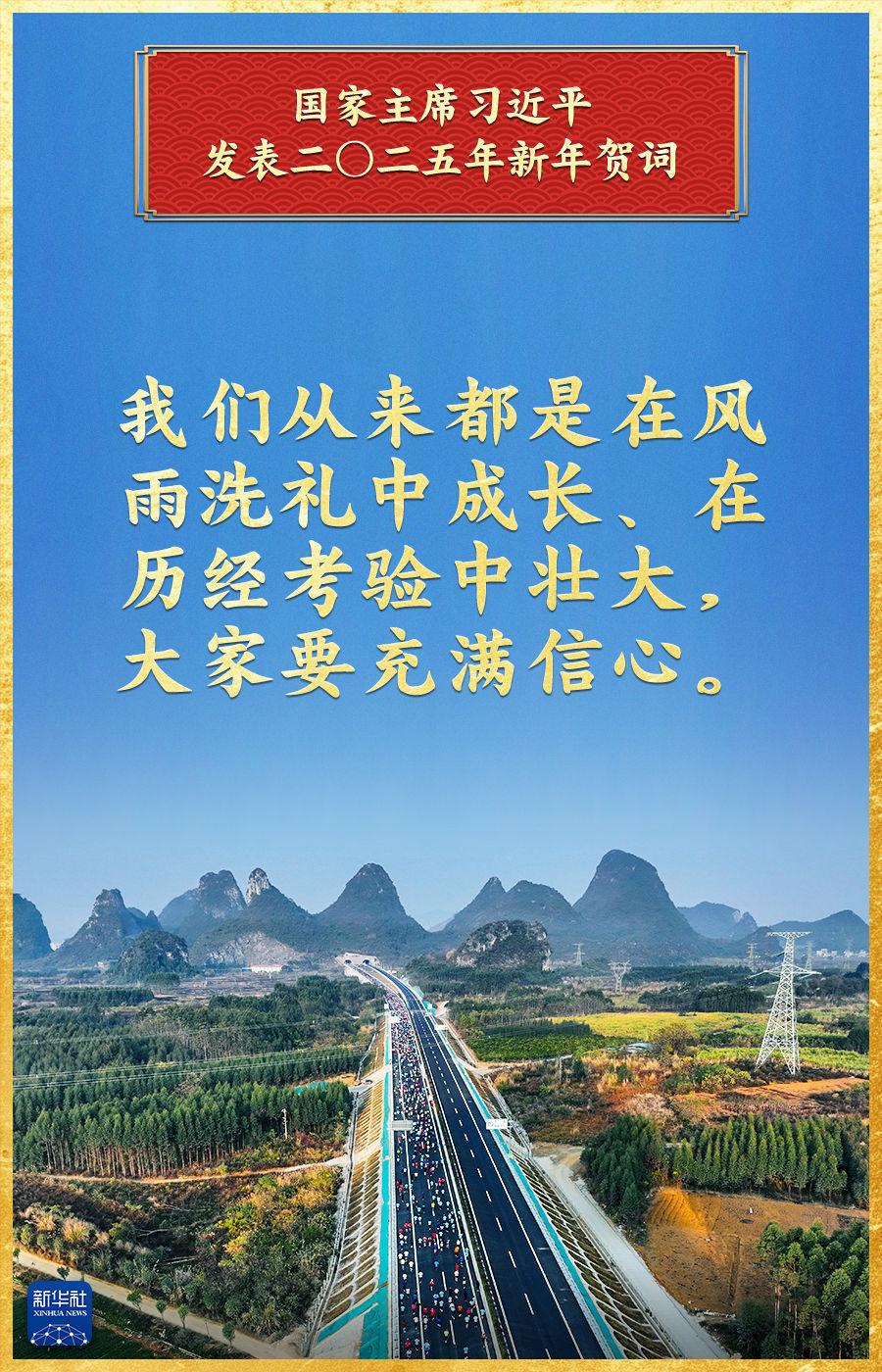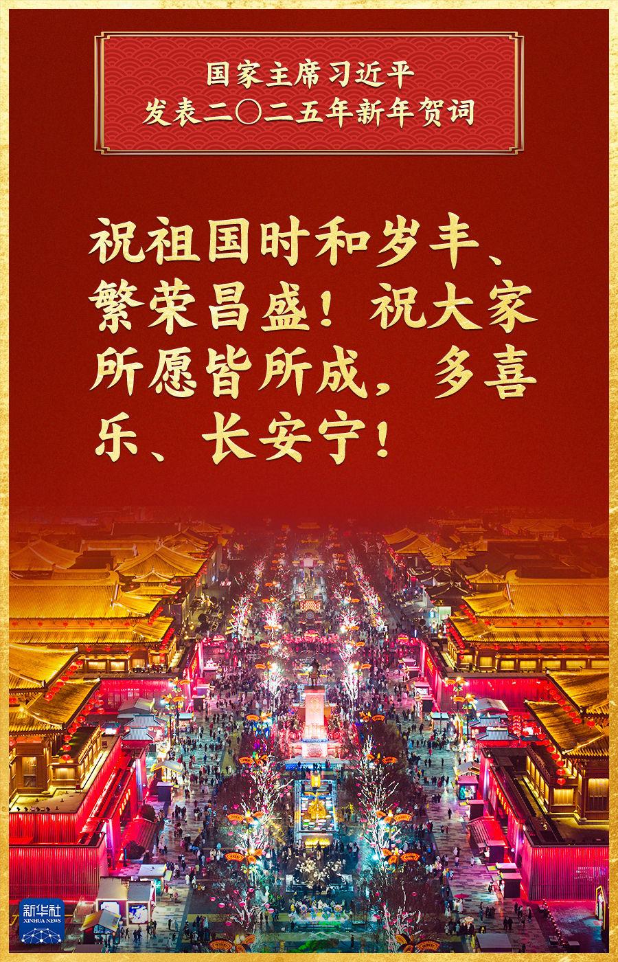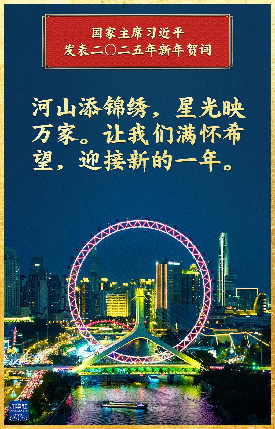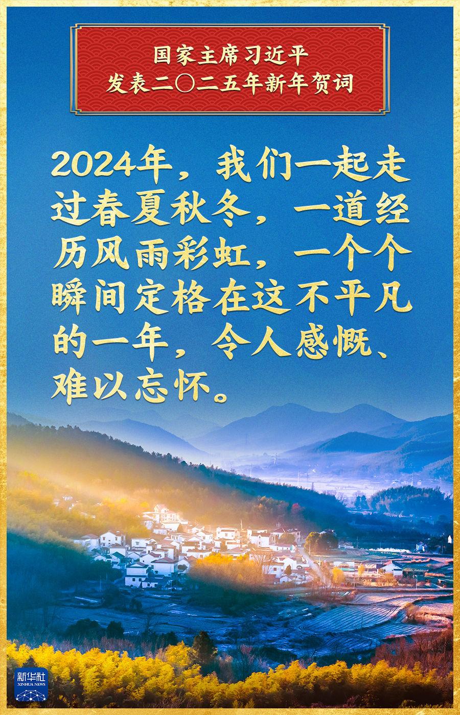 “中国式现代化的新征程上,每一个人都是主角,每一份付出都弥足珍贵,每一束光芒都熠熠生辉。”辞旧迎新之际,国家主席习近平发表2025年新年贺词。贺词深情回顾过去一年的奋斗历程和辉煌成就,吹响新的一年风雨兼程再出发的奋斗号角,激荡起亿万人民奋进中国式现代化新征程的磅礴力量。