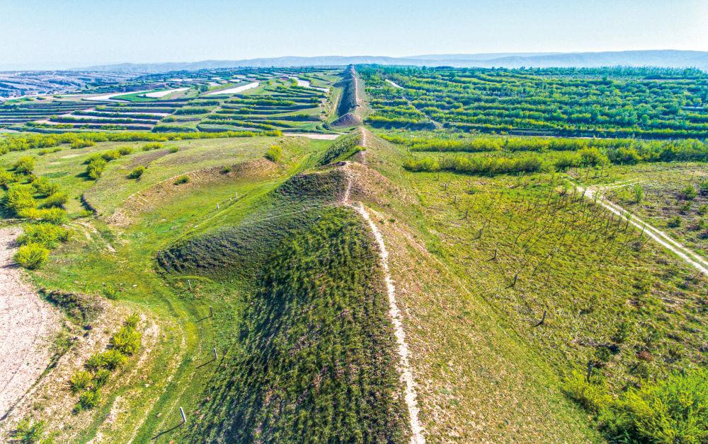 村庄静谧,青山巍峨,远处烽火台、墩台依稀可见。透过城墙残垣,可见宝中铁路和344国道穿村而过,山麓间庄稼油绿,圈棚里牛羊成群……悠悠古道,勃勃生机,千年变迁,这一刻无缝切换。