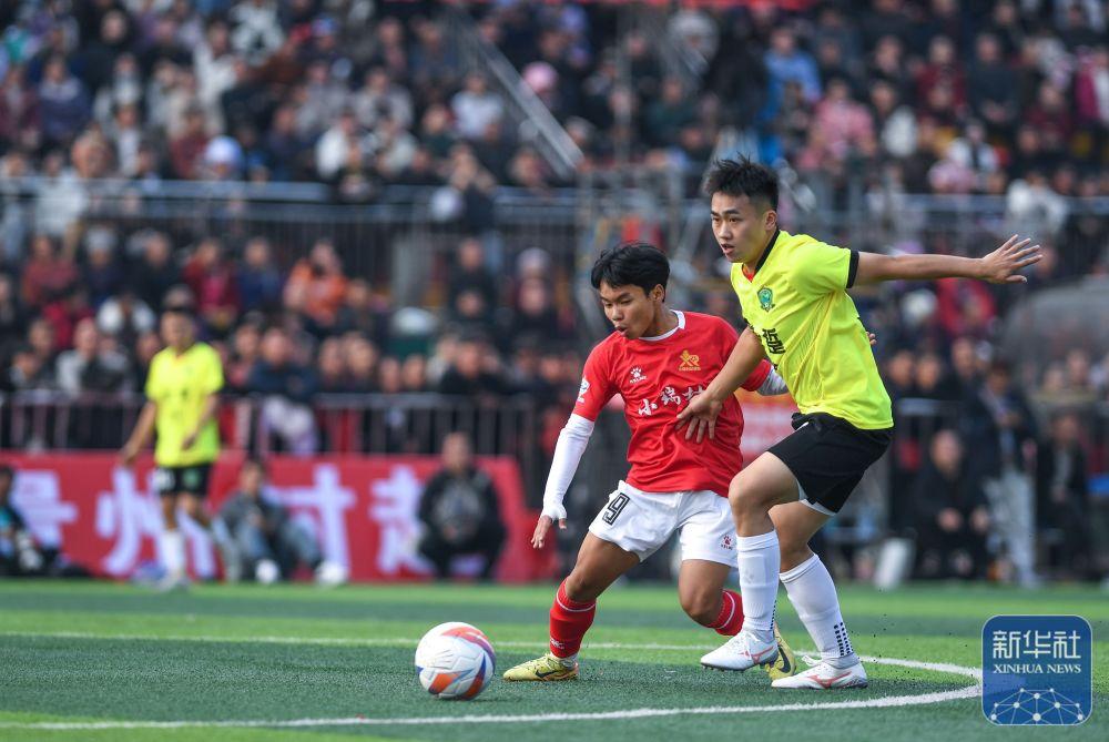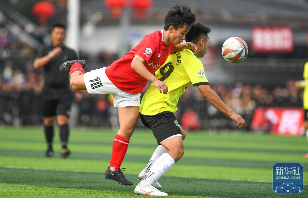 ↑小瑞村足球队球员石龙(左)与盘踅村足球队球员在揭幕战比赛中。