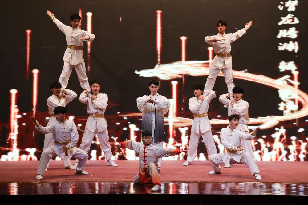 ↑1月10日,在沙特阿拉伯首都利雅得文化宫举行的“新春大集”活动上,演员表演中国武术。