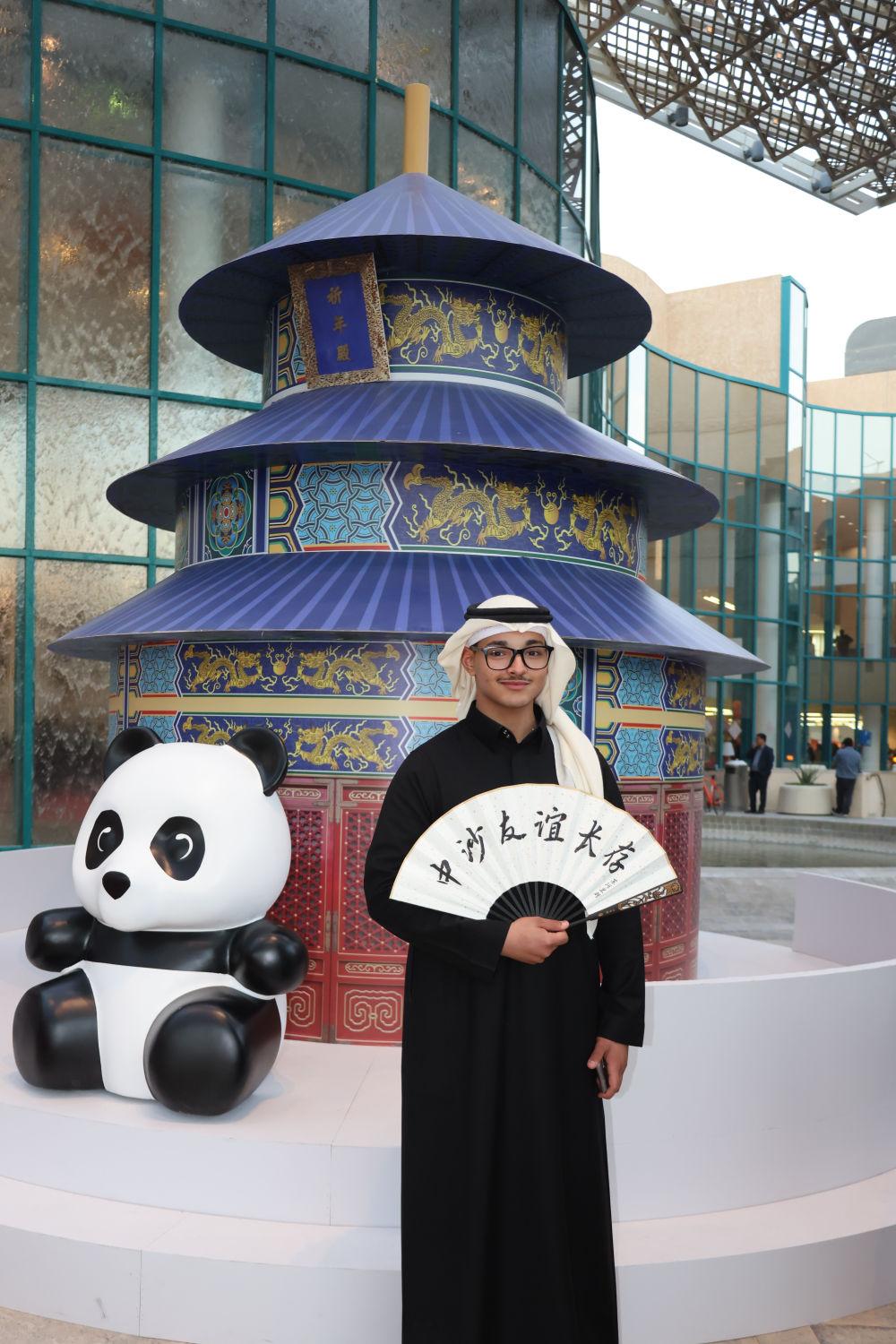 ↑1月10日,在沙特阿拉伯首都利雅得文化宫举行的“新春大集”活动上,一名男子在天坛模型前留影。