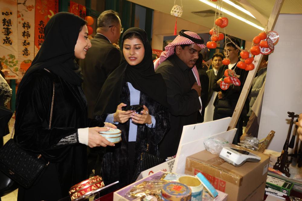 ↑1月10日,在沙特阿拉伯首都利雅得文化宫举行的“新春大集”活动上,人们选购商品。