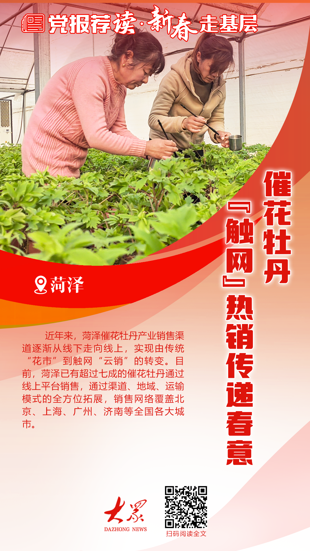 近年来,菏泽催花牡丹产业销售渠道逐渐从线下走向线上,实现由传统“花市”到触网“云销”的转变。目前,菏泽已有超过七成的催花牡丹通过线上平台销售,通过渠道、地域、运输模式的全方位拓展,销售网络覆盖北京、上海、广州、济南等全国各大城市。“这一转变促进了物流运输的扩大、服务质量的优化、运营效率的提升和成本的节约,还显著增强了菏泽牡丹的品牌影响力和市场竞争力。”菏泽市花木协会会长、绿美牡丹产业园负责人孙文起说,他的产业园今年培育了20万盆催花牡丹,占全市总额的1/3,电商直播成为主要销售渠道。