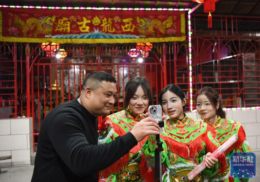 1月20日,在广东汕头潮阳区的西龙古庙,英歌教练陈坍鹏(左一)和队员观看网络直播平台。