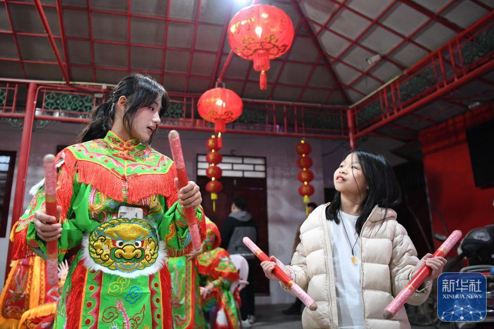 1月20日,在广东汕头潮阳区的西龙古庙,西门女子英歌队队员在指导小朋友领会英歌动作要领。