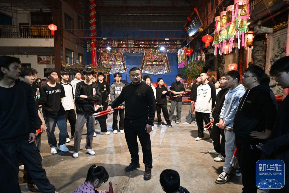 1月21日,在广东汕头潮阳区的塔馆双忠祠,英歌教练陈坍鹏(中)在指导队员。