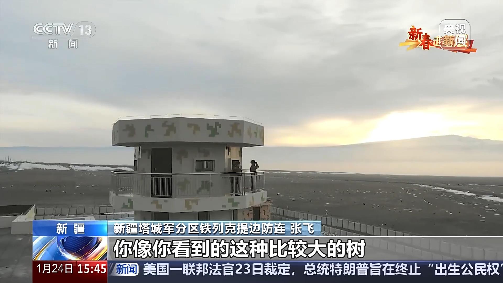 新疆塔城军分区铁列克提边防连 张飞:像今天这种天气的话,可能在冬季两三个月的时间,可能有这么一两天,这种天气是非常难得的。你像你看到的这种比较大的树,它最少有15年的树龄了,我们一茬茬官兵经过不懈的努力才把这些树种成这样子,一场大风可能就把刚种下去的树就连根拔起了,前几天在一场大风的时候就把旗杆给吹倒了,就在那个地方放着。