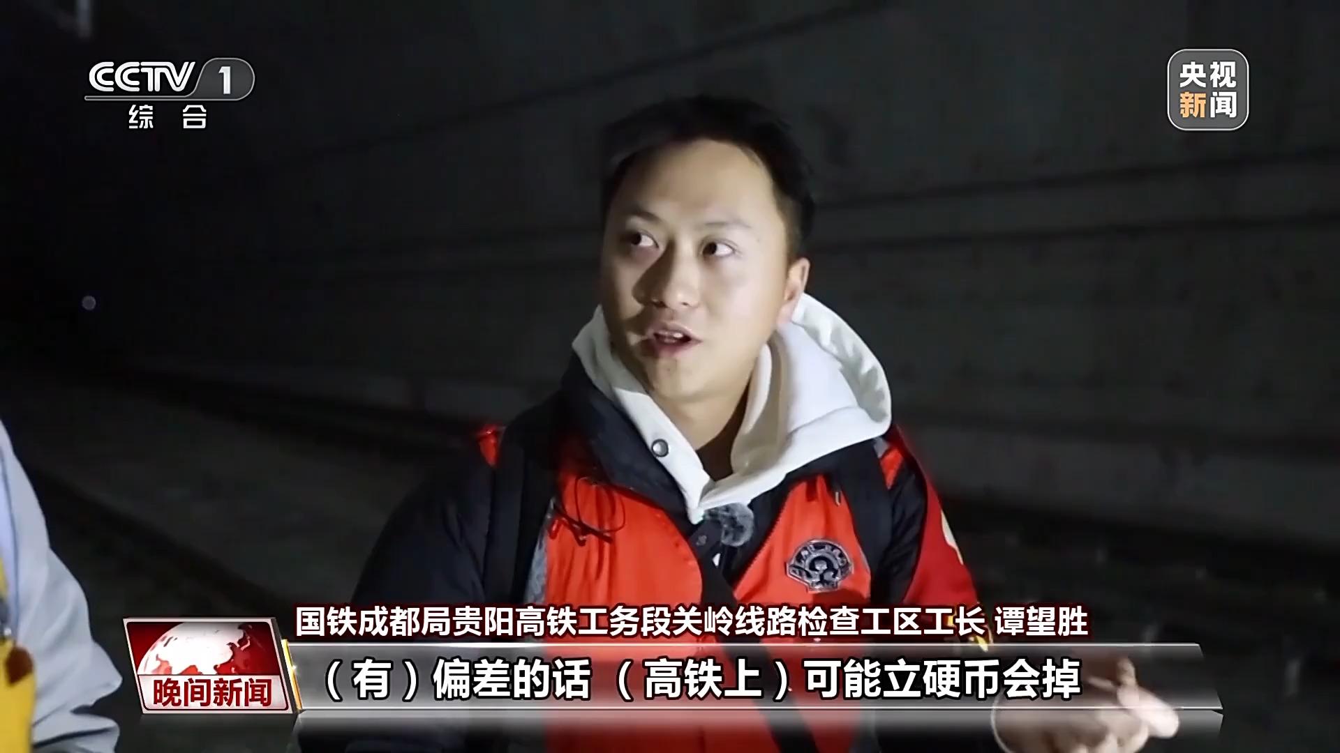 国铁成都局贵阳高铁工务段关岭线路检查工区工长谭望胜:主要目的就是保持线路的一个平顺度,提高旅客坐车的舒适度,有偏差的话,高铁上可能立硬币会掉,水杯会晃。