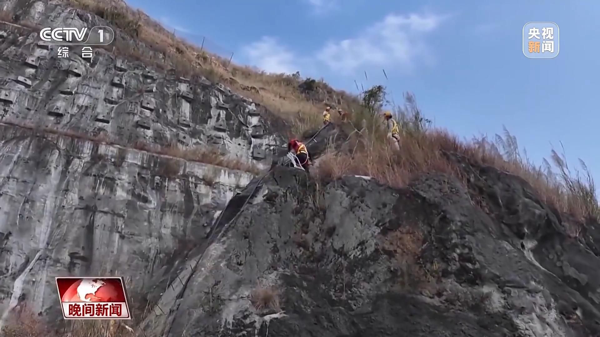 从崖壁到桥墩,还需要再下一段沿江的陡坡,只能靠安全绳。崖壁近乎垂直,往下看,就是江水。上山,再下山,一共用了半个多小时。