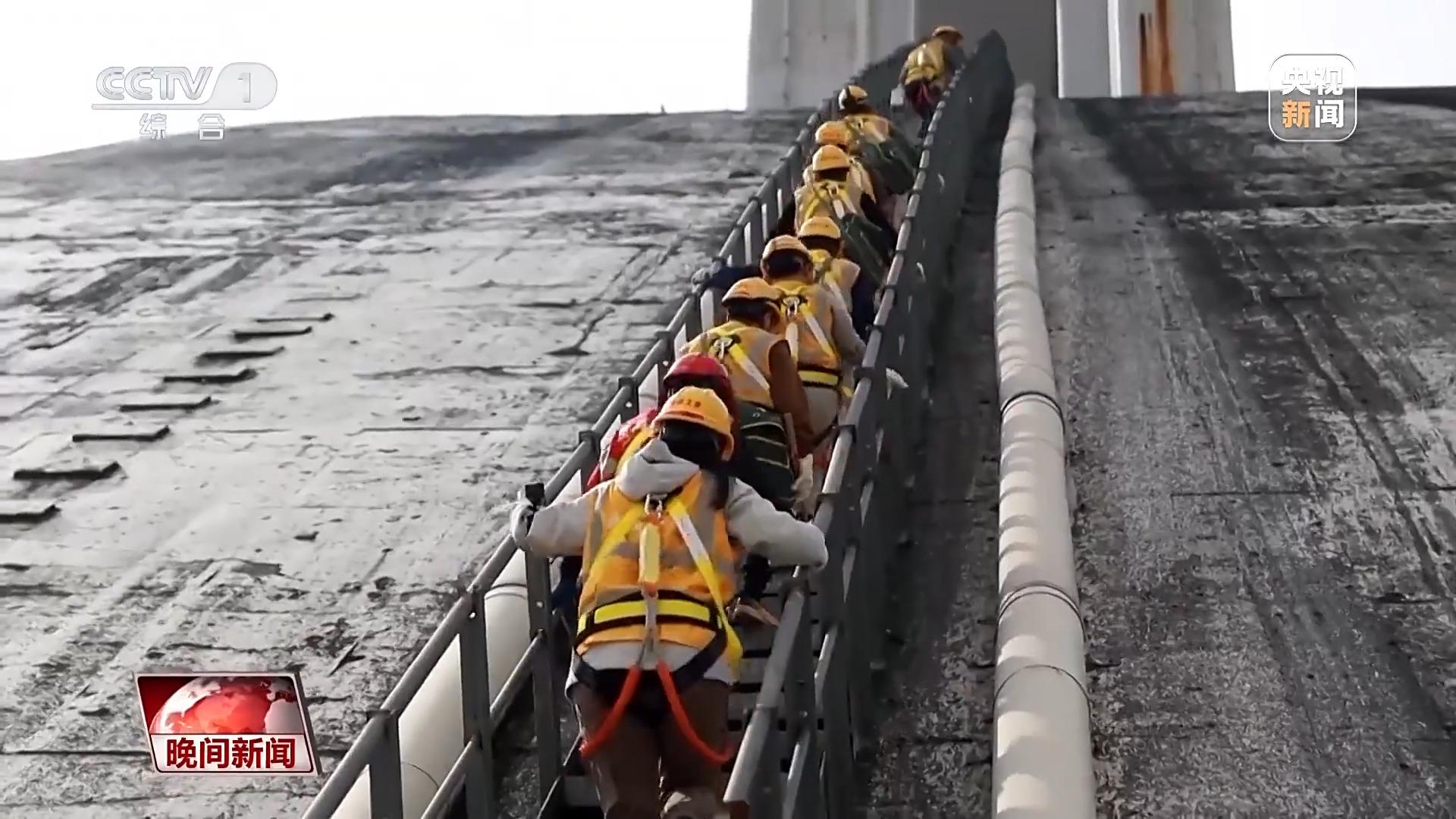 从拱圈回到桥墩,难度最大的爬高挑战才刚刚开始。为了检查100多米高的墩身,需要再爬550多级的垂直镂空台阶,每一边每次只能上一个人。