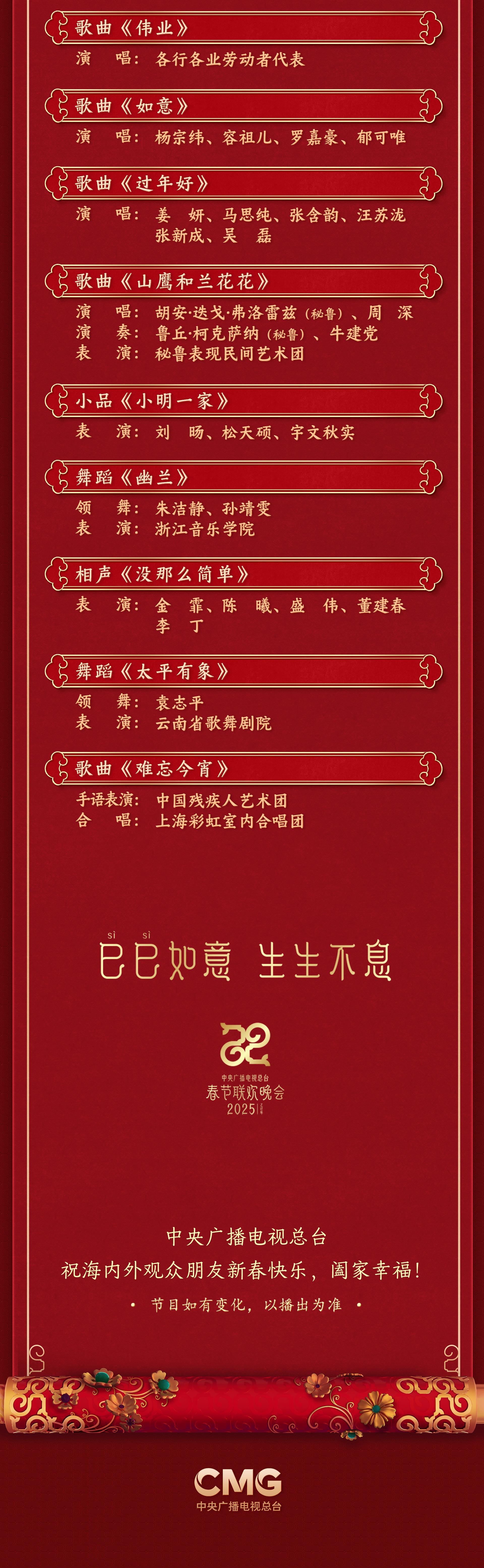 中央广播电视总台《2025年春节联欢晚会》节目单正式发布。在“欢乐吉祥、喜气洋洋”的主基调中,总台蛇年春晚以“巳巳如意,生生不息”为主题,汇聚歌曲、舞蹈、相声、小品、戏曲、武术、魔术等各类型节目,与全球受众共享年味,同庆新春!
