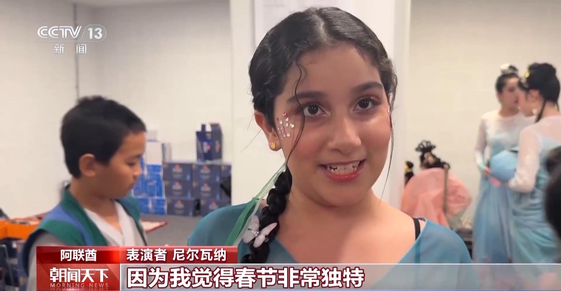 表演者 尼尔瓦纳:你好,我是尼尔瓦纳,我很高兴能够参与春节演出的表演。因为我觉得春节非常独特,有非常传统的服饰,就像我现在穿的这一套。我也很喜欢她们的发型和妆容,我真的很喜欢一切。而且我在这里认识了很多中国人,所以学了一点中文,比如“你好”“你好吗”“我很好”还有“谢谢”。我真的很喜欢中国文化。
