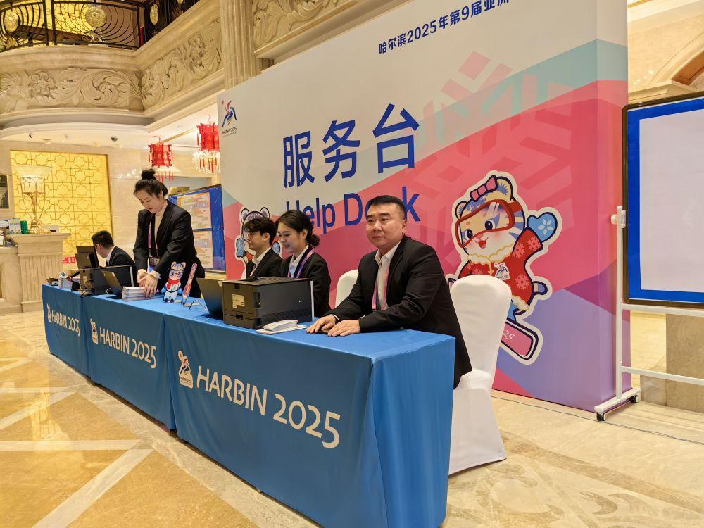 在酒店大厅,亚冬会元素的背景板前,工作人员正在服务台做着入住的接待准备工作;媒体工作间内桌椅摆放整齐,电脑等设备一应俱全;医疗室内,医疗卫生经理李百韬和同事清点着药品……