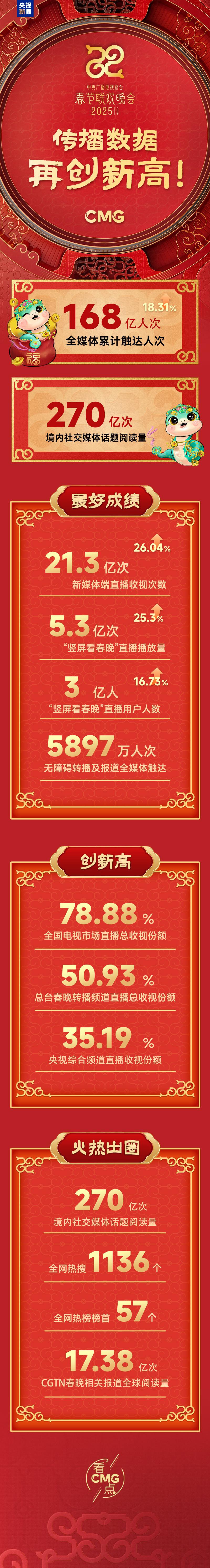 电视收视创多年来新高。总台2025年春晚在全国电视市场的直播总收视份额达78.88%,创近12年以来收视新高。其中,总台春晚转播频道的直播总收视份额达50.93%,央视综合频道(CCTV-1)直播收视份额35.19%,均创近14年以来收视新高。