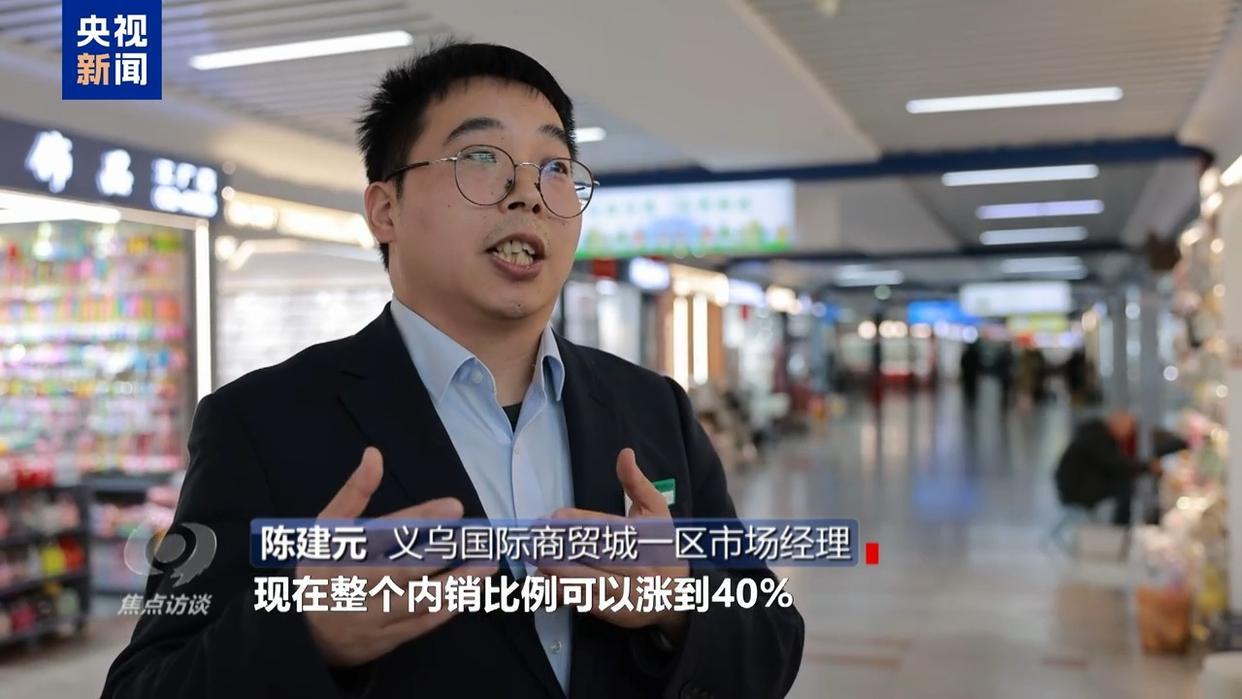 义乌国际商贸城一区市场经理 陈建元:我们有一个统计,拿我们的饰品行业来说,经过这几年培育,直播电商的快速发展,有些经营户转型,现在整个内销比例可以涨到40%,比例还是有一个很明显的提升。