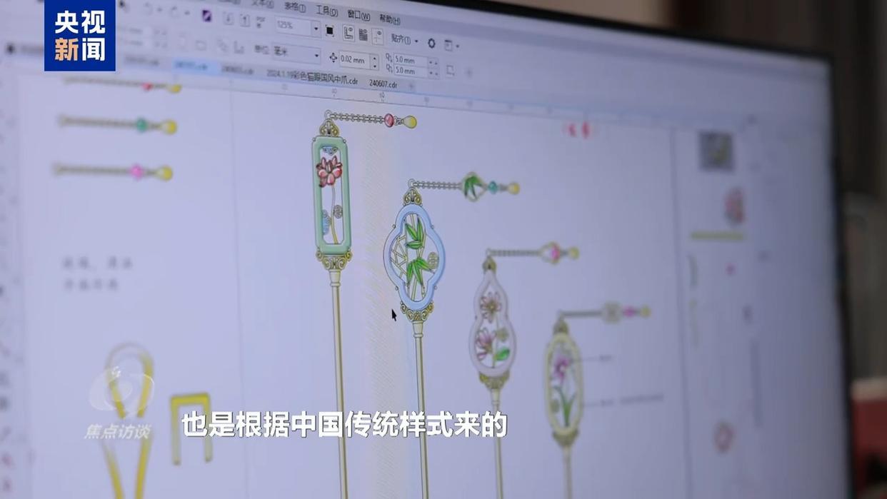 义乌某饰品公司产品设计师 周亮:梅兰竹菊有传统的一些寓意,然后这些图案的外形,也是根据中国传统样式来的。材料方面,我主要是想体现中国的那种翡翠的感觉。