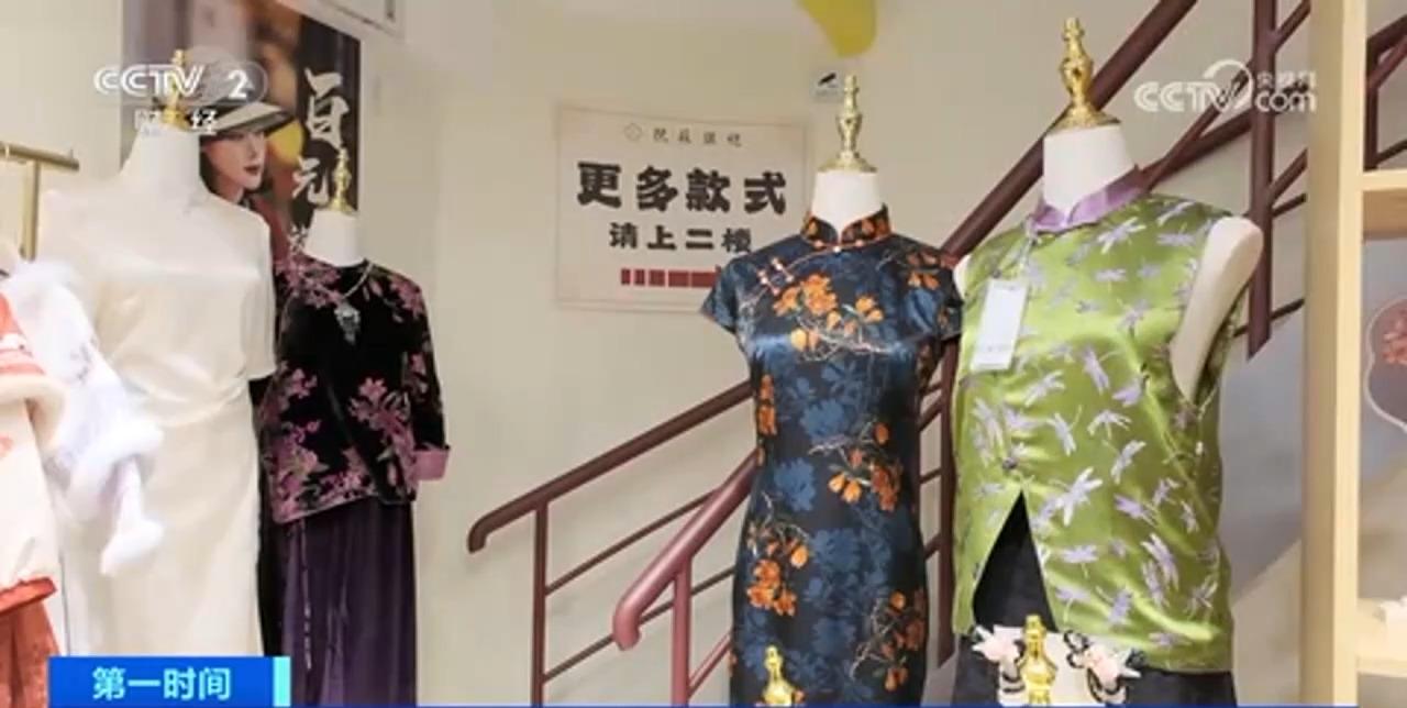上海田子坊某旗袍店店长 首仁欣:外国游客会给家里带中国特色的丝巾、刺绣,也会购买旗袍。因为外国人的入境消费,店铺的销量、营业额增长大概10%。