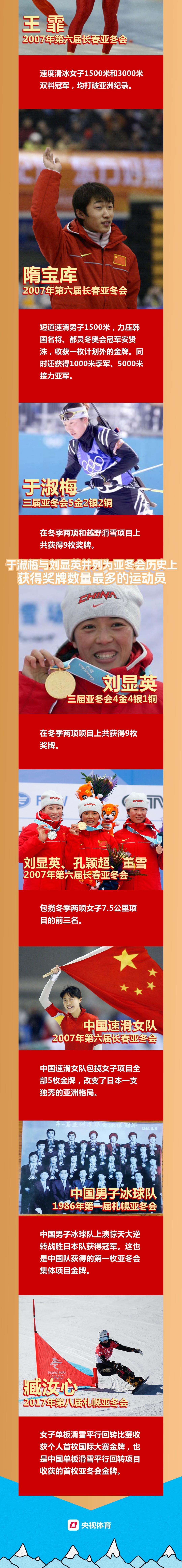 从速度滑冰的王秀丽、叶乔波,到短道速滑的大杨扬、李佳军、武大靖,再到花样滑冰的申雪/赵宏博等,他们的努力、他们的拼搏,为中国冰雪运动赢得了荣誉和尊重,他们的精神在亚冬会的历史画卷上熠熠生辉。