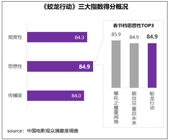 《蛟龙行动》为林超贤导演又一部军事题材力作,影片延续了《红海行动》紧张激烈的战斗场景,展现出的中国军事力量与自信让观众感受到勇气和热血。影片观众满意度得分84.4分,三大指数中思想性得分最高,为84.9分,与《熊出没・重启未来》并列档期第二位。