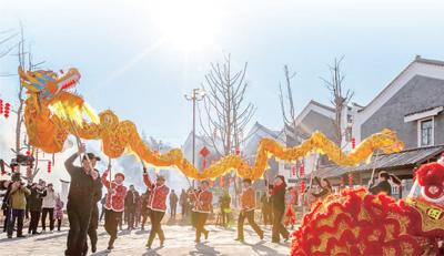 湖北武汉市大余湾村村民舞龙舞狮欢庆春节。