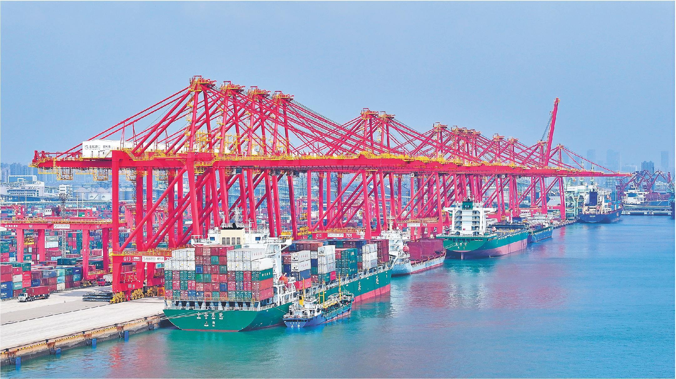 山东港口日照港集装箱码头,轮船在停泊作业。(□资料图)
