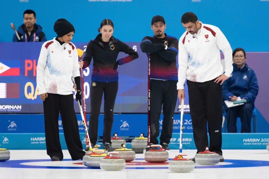 △2月5日,亚冬会冰壶混双循环赛B组第3轮比赛中,菲律宾队11比3战胜卡塔尔队。