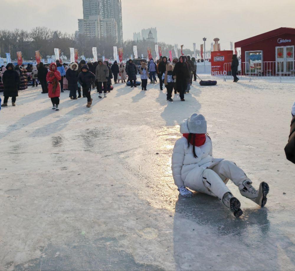 不过,无论哪种表现,他们与冰面大面积接触的概率都差不多,只不过前者趴在冰上,后者往往摔得四仰八叉,结果引来的都是一串“hàhàhàhà”的爆笑。全副武装的游客也不会摔疼,给周围路人带来的欢乐却是实打实的。游客第一次摔,往往站起来拍拍屁股,挤出一些羞涩的笑;两次三次过后,那就轻车熟路了,嘴角往往比人还先站起来。