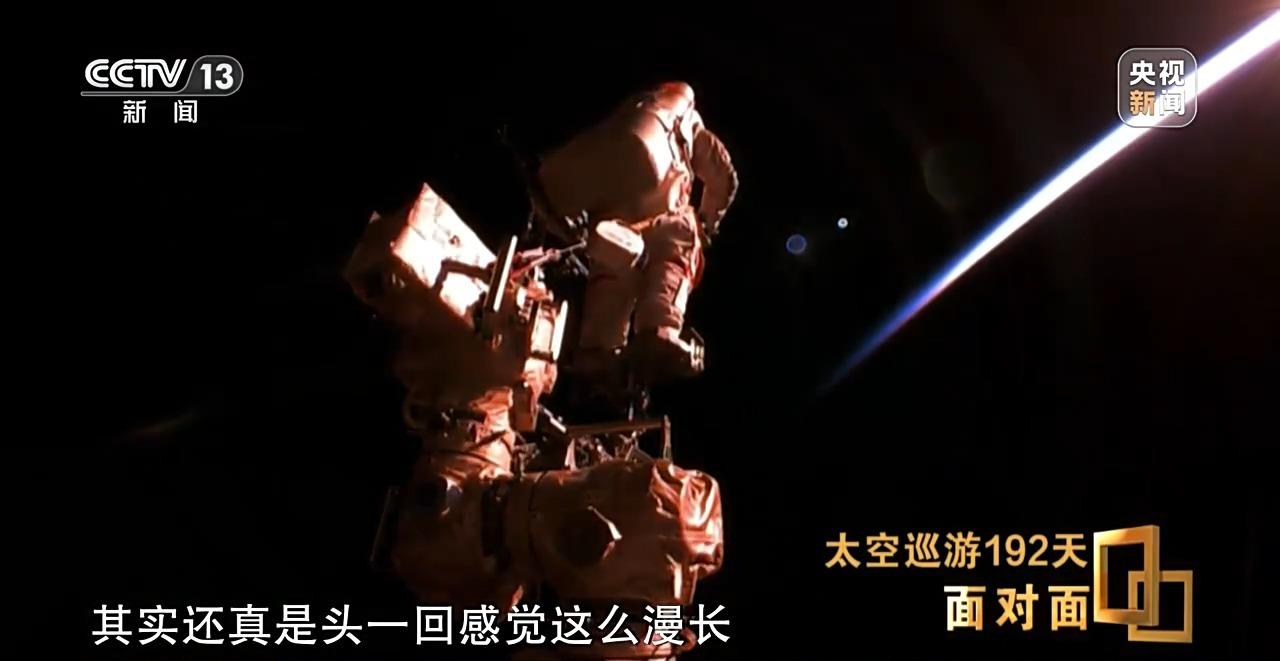 叶光富:第一次出舱全程8.5个小时,在外面作业其实还真是头一回感觉这么漫长,时间过得这么久,就是一会儿阳照,一会儿阴影,过了四五个至少。随着时间的推移,你就能发现在地球的一侧,慢慢出现一条弧形的亮带,而且在中间某个点就有一个红色的亮点就会越来越大,形成亮斑,这就是太阳。这束光透过面窗,照到你的脸上,说实话也照到你的心里了,就那会儿感觉,这一束光不光带来了温暖,在黑暗中也带来了希望。