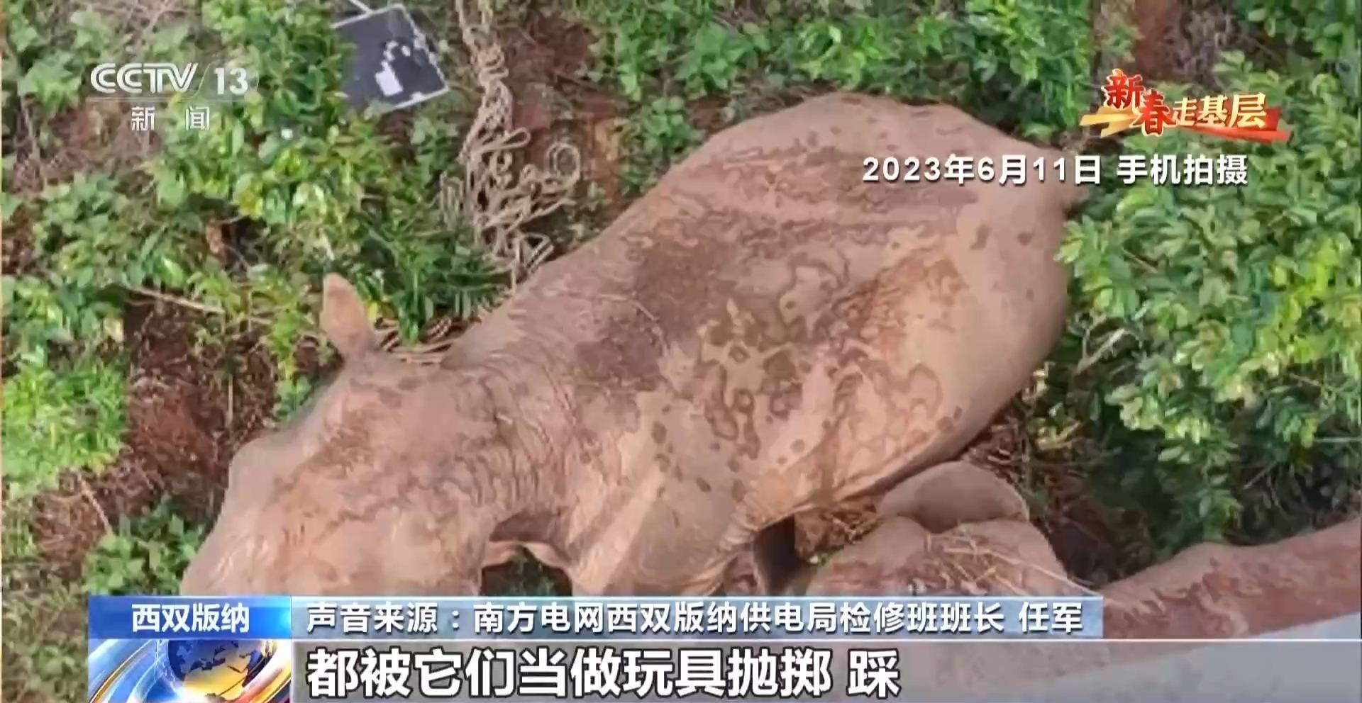 南方电网西双版纳供电局检修班班长 任军:破坏力还是较大的,我们自己带的那些设备、工器具,都被它们当作玩具抛掷、踩。尽量能少遇到是最好的,但是遇到了,我们就要避险,爬到塔上去。