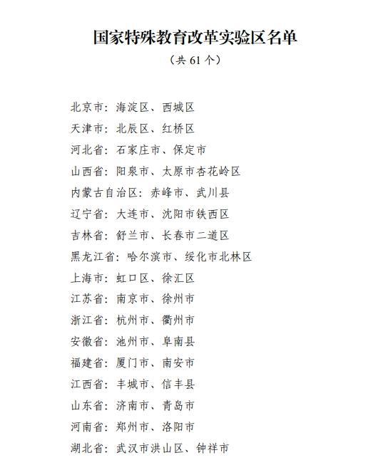 记者2月10日从教育部获悉,经各地自主申报、省级推荐、网络公示等环节,认定北京市海淀区等61个国家特殊教育改革实验区。