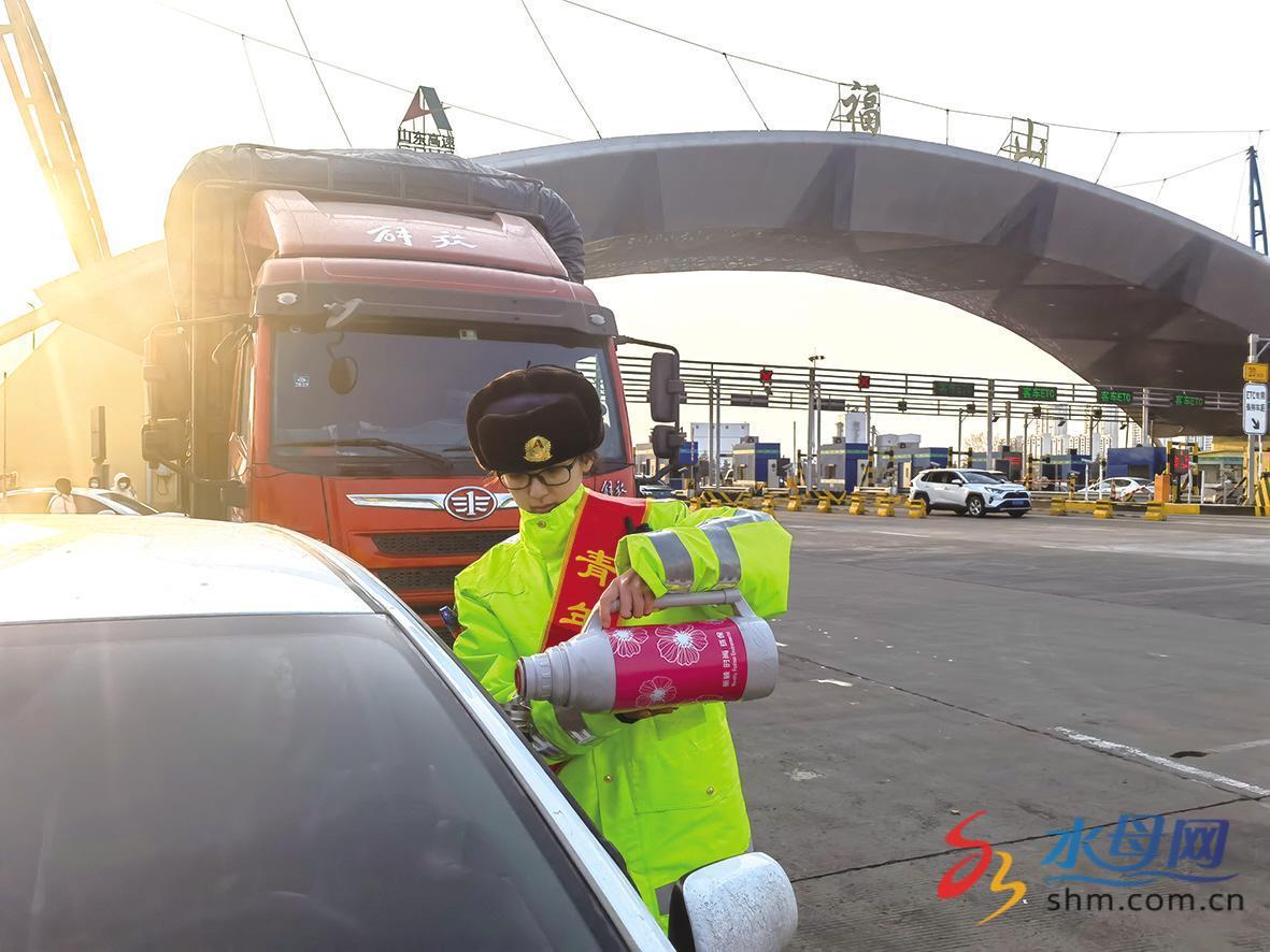 昨天上午8点,沈海高速福山收费站,一位返程的驾驶员在收费站广场,接过了收费站工作人员递来的热水。