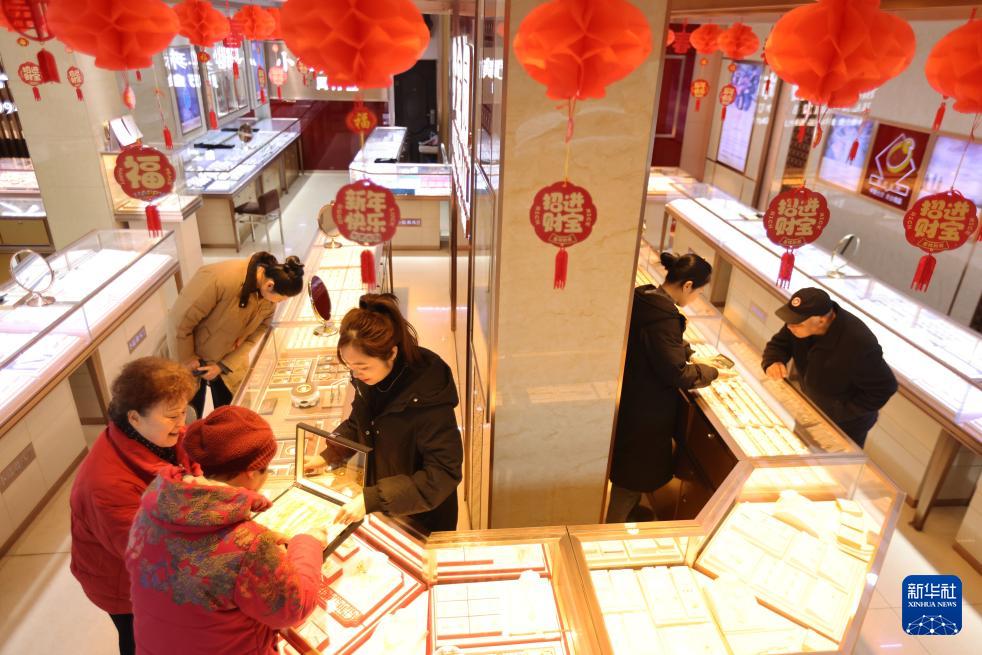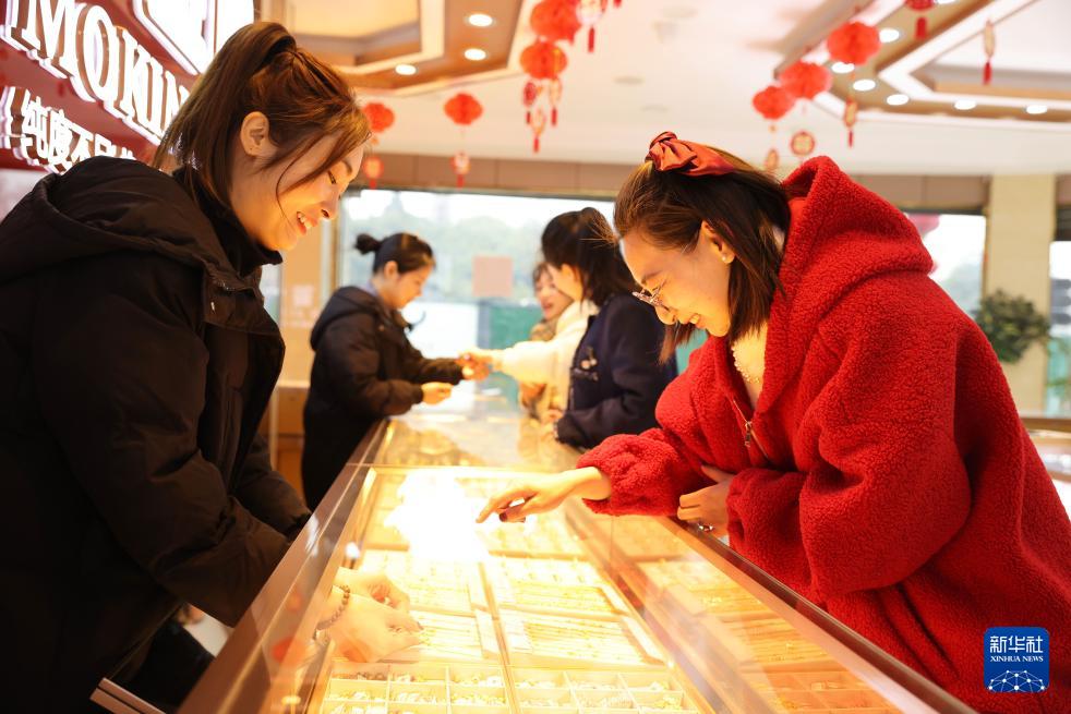 2月11日,顾客在浙江省湖州市德清县乾元镇一家金店挑选黄金首饰。