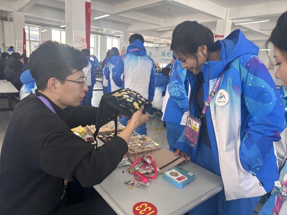 新华社哈尔滨2月13日电(记者戴锦镕、魏婧宇、马思嘉)“你好,换‘pin’吗?”在哈尔滨第九届亚冬会各个场馆,经常能听到以换“pin”破冰的对话。